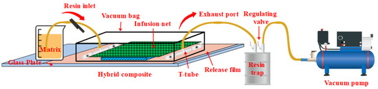 There are three distinct phases in Figure 1a: The purely elastic behavior of the material shows when the stress is less than . The stress is less than , and the material exhibits pure elastic behavior. At critical stress, the forward transition is caused by a stress-induced martensitic transformation (austenite-martensitic). Large transformation strains occur during martensite formation (upper platform). When the stress increases to , SMA is in the martensitic phase, indicating that the forward transformation is completed. Martensite exhibits elastic behavior when the stress exceeds . During unloading, the reverse phase transition from martensite to austenite begins at and completes at . Due to the difference between and , and the difference between and , a hysteresis curve is found in the load/unload stress–strain curve [36,37,38,39,40]. Figure 1b shows the experimental stress–strain curve of the SMA wire. Table 1 shows the material parameters of the SMA wire [41]. Vacuum-assisted resin injection (VARI) was used to prepare composite laminates, as shown in Figure 2, with vacuum curing at room temperature for 9–12 h. The laminate is composed of 10 layers of glass fiber cloth. The structural arrangement of SMAHC laminates is shown in Figure 3. The size of the specimen is 80 mm × 25 mm × 2.4 mm. The number of flexural specimens is given in Table 2. In Table 2, different types of specimens are numbered according to the ply form of bending specimens. B-1, B-2, B-3 and B-4 represent the type of specimen, and B-2-2/4/6/10 represents the embedding of 2/4/6/10 SMA in B-2 specimens, respectively.