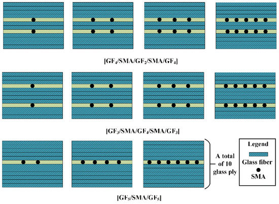 In terms of superelastic research, Viet and Zaki [16] propose a novel and simple exact semi-analytical model for superelastic SMA wire-reinforced composites subjected to bending loads. The composite is found to behave superelastically under certain conditions of temperature, SMA volume fraction, and elastic stiffness of the matrix. Viet et al. [17] also proposed a new analytical model for a superelastic shape memory alloy prismatic cantilever beam subjected to a concentrated force at the tip. Analytical moment curvature and shear force–shear strain relations are also derived during the loading and unloading of the beam. Pattar et al. [18] researched the mechanical properties of glass/epoxy composite by embedding shape memory alloy and nanoclay. Results show that the flexural strength of SMA/MMT/glass/epoxy composite was improved by 21%, when it was compared with composite with glass/epoxy composite. Aslani et al. [19] used four different codes to calculate the flexural toughness of the shape memory alloy, polypropylene and steel fiber-reinforced self-compacting concrete. It is found that the shape memory and superelasticity of NiTi SMA are effective in delaying initial crack formation and limiting crack width. Pazhanivel et al. [20] adopted the method of embedding nickel–titanium SMA in the cross-section below the neutral axis of glass fiber-reinforced polymer (GFRP) composites to enhance the bending resistance of the composites. Under static loading condition, up to 4 wt% of shape memory alloy reinforcement, the GFRP exhibit enhanced flexure resistance. Katsiropoulos et al. [21] improved the damping behavior of fiber reinforced polymer composites with embedded superelastic SMA. It was found that the addition of Ni-Ti wires into the aramid/epoxy composite leads to a significant modification of its damping, which depends strongly on wire volume fraction. Taheri-Behrooz et al. [22] developed research to predict stress transfer and interfacial behavior between shape memory alloy wire, interphase, and matrix. Inhomogeneous interphase and different radial and hoop stress components in each phase are considered to achieve deeper physical understanding. Khalili et al. [23] investigated the flexural properties of sandwich composite panels with glass laminate aluminum-reinforced epoxy facesheets strengthened by SMA wires. The results represent the advantage effect of shape memory alloy wires on the behavior of sandwich composite panels in bending. Although there have been many studies on the influence of SMA content on the mechanics of composite materials, the current researches on the influence of SMA wire embedding position and content on SMAHC laminates and the finite element modeling of SMAHC laminates are not detailed enough.