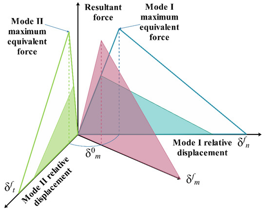 The surface-based cohesive contact model in ABAQUS was used to simulate the composite effect of laminates [45,46,47]. The interface behavior is governed by a mix-mode bilinear traction–separation law, which assumes an initially linear elastic response followed by the linear evolution of damage, as displayed in Figure 6.