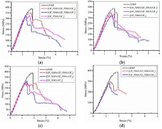 Figure 7 shows the flexural stress–strain curves of different types of SMAHC and GFRP specimens. It can be seen from the figure that the curve shows a linear response near the origin, and then a nonlinear response until it breaks. The transition from linear response to nonlinear response is often caused by matrix cracking [15]. In Figure 7, the flexural strength of all SMAHC laminated plate specimens is lower than that of GFRP. This is due to the material difference between the matrix and SMA, which will form a weak interface between SMA and the matrix, resulting in stress concentration on the surface of the SMA wire. All specimens of SMAHC laminates show good ductility, which is also due to the presence of SMA, so that the specimens do not suddenly lose the bearing capacity as with GFRP laminates. It can be observed that SMAHC laminates (B-2-4) have the highest bending performance. The flexural performance of SMAHC laminates is given in Table 4 [27]. The flexural strength of SMAHC laminates (B-2-2/4/6) is 368.62 MPa, 369.17 MPa and 318.73 MPa, respectively. Compared with the GFRP laminate, the flexural strength is decreased by 5.84%, 5.76% and 18.63%, respectively. However, the flexural modulus increased from 22.73 GPa to 23.91 GPa, 23.73 GPa and 23.74 GPa, respectively. In addition, the flexural performance of B-2-6 and B-2-10 laminates decreases more obviously than that of GFRP laminates.