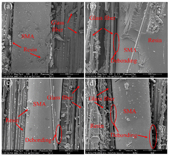 Figure 9 shows SEM micrographs of fracture surfaces of different SMAHC specimens (B-3). The microstructure of the interface between the specimen matrix and SMA wire can be observed in Figure 9. Figure 9a–d corresponds to SMAHC specimens (B-3-2/4/6/10). In Figure 9a, only a small amount of resin remains on the surface of the SMA, and significant debonding is observed between the matrix and the SMA. SEM micrograph of the SMAHC specimen (B-3-4) is shown in Figure 9b. SMA is well-wrapped by the resin matrix and only slightly debonded, indicating that the interface at the fracture surface has no obvious negative effect on the degradation of the specimen properties during loading. In Figure 9c, there is obvious debonding between SMA and matrix, and the glass fiber is broken and part of the fiber is pulled out. As shown in Figure 9d, complete debonding occurs between SMA and matrix, indicating that the specimen has completely failed at this time.