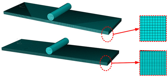 The convergence of the numerical simulation of the model is tested. The number of elements in the original model is 50,000, and the number of elements in the new model is 100,000. The new model only adds elements in thickness. Figure 11 presents two models. A comparison of GFRP laminates between the original and new model is shown in Figure 12. The new flexuous strength and flexuous modulus of GFRP laminates (B-1) are 375.65 MPa and 24.73 GPa, respectively. The errors of simulation results and experimental results are 1.59% and 1.47%, respectively, which meet the requirements of accuracy.