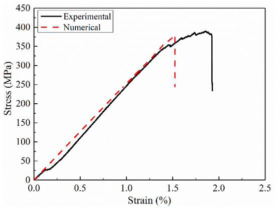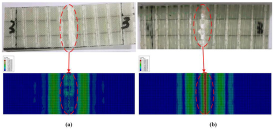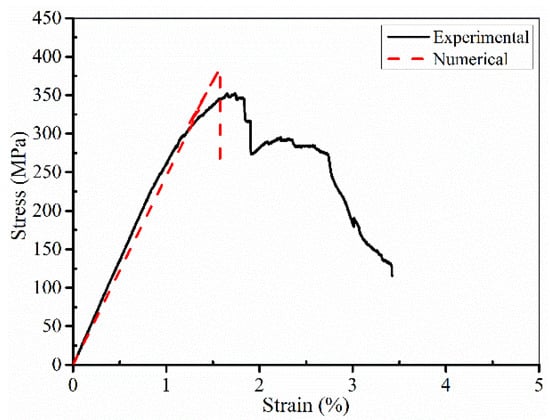The comparison between the stress–strain curve obtained from the bending test of GFRP laminates and the simulation results is shown in Figure 13. It is found that the macroscopic stress–strain curves obtained from experimental tests are basically consistent with those obtained from simulation. The simulated flexural strength and flexural modulus of GFRP laminates (B-1) are 381.71 MPa and 25.1 GPa, respectively. The errors of simulation results and experimental results are 2.56% and 10.43%, respectively, which meet the requirements of accuracy. The experimental and simulation results of GFRP laminates in failure are given in Figure 14. In Figure 14a, the resin matrix on the compression side of the laminate is crushed and a white indentation appears, which is consistent with the simulated failure mode. However, in the tensile side of the laminated plate (Figure 14b), no obvious damage to the matrix occurred in the experimental results and simulation results.