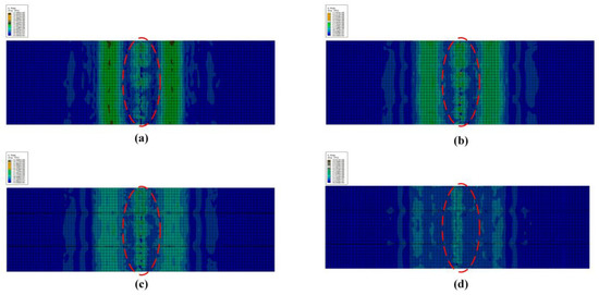 Damage contours of layers 2–5 above the neutral layer of SMAHC laminates. (a) Second layer, (b) Third Layer, (c) Fourth layer, (d) Fifth layer.