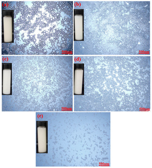 Optical microscopy images of emulsions stabilized by: (a) 1%-CT/1%-AG, (b) 1%-CT/2%-AG, (c) 1%-CT/3%-AG, (d) 1%-CT/4%-AG, and (e) 1%-CT/5%-AG.