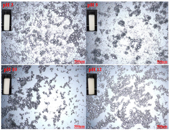 Optical microscopy images of 1%-CT/1%-AG emulsion under different pH levels.