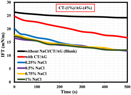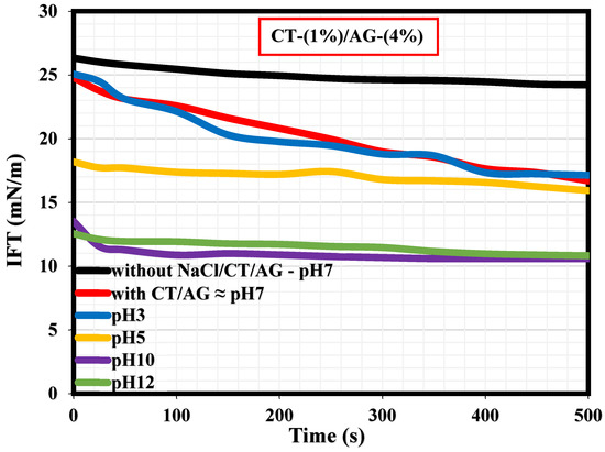 A literature survey revealed that only a few studies have actually reported the interfacial tension (IFT) measurements explaining the adsorption kinetics at the diesel/water interface in the presence and absence of surfactants [36,37,38,39,40]. To our knowledge, the current study would probably be the first research endeavor reporting the IFT measurements of migration of CT/AG emulsifiers at the diesel/water interface and how NaCl salt and pH affect the CT/AG particle adsorption at the diesel/water interface. Figure 10 shows the dynamic IFT measurements revealing the adsorption kinetics at the diesel/water interface with and without 1%-CT/4%-AG, and also in the presence of various NaCl concentrations dissolved in 1%-CT/4%-AG solution. Accordingly, the IFT values of diesel/water in the absence of NaCl/CT/AG remained fairly constant for a period of 500 s, and the average IFT value was 26.16 mN/m. This IFT value of diesel/water in the absence of NaCl/CT/AG is in agreement with the value reported in a previous study [37]. Following the introduction of CT/AG and 0.25–1% NaCl concentrations in water, drastic reductions in IFT at the diesel/water interface were evident, and the reduction was more pronounced in the presence of salt. Certainly, the dispersion of CT/AG in water and various NaCl solutions triggered interfacial tension reduction at the diesel/water interface. The IFT at the diesel/water interface decreased to approximately 16.69 mN/m in the presence of CT/AG alone and to 12.04 mN/m following the addition of different NaCl concentrations after 500 s. Shown in Figure 11 are the dynamic IFT measurements, elucidating the effect of different pH levels of dispersed 1%-CT/4%-AG solution at the diesel/water interface. Evidently, dispersed 1%-CT/4%-AG solution at pH 3, 5, 10, and 12 was examined, causing further IFT reduction at the diesel/water interface compared to the IFT response of 1%-CT/4%-AG solution under pH 7. Dispersion of 1%-CT/4%-AG solution under pH 3 and 5 led to IFT reduction to 17.13 mN/m and 15.93 mN/m, respectively, while the dispersion of 1%-CT/4%-AG in water under pH 10 and 12 induced almost the same IFT value of approximately 10.82 mN/m after 500 s.