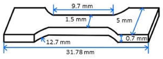 PLA/TPU blends were prepared with different mass ratios of PLA to TPU (30/70, 50/50, and 70/30) via a melting blend method at 200 °C. Briefly, the PLA and TPU mixture of a preset mass ratio was dried in an oven at 80 °C for 4 h. The PLA/TPU mixture was heated to 200 °C to a molten state, which was then injected into a mold at 2.94 MPa to form a PLA/TPU plate. The plate was cooled down to 30 °C. Using laser cutting, specimens in a dumbbell shape, as shown in Figure 1, were prepared. The specimens were mechanically ground with CarbiMet papers of 400, 800, 1200, and 2500 grit, consecutively, and then polished with 1 alumina slurry. The polished specimens were annealed in the air in a furnace at 50 °C for 24 h to release the residual stresses introduced during the sample preparation and then naturally cooled down to room temperature in the furnace.