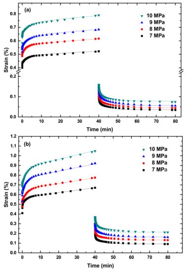 It should be noted that there are extensive studies on the creep deformation of a variety of polymers, including polyurethanes [,]. The analysis has been based on the use of dashpot-spring models in describing the creep curves. However, there are little studies on the calculations of the activation energies of the rate processes for the creep deformation of polymers.