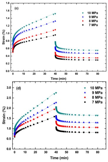 Currently, most studies have been focused on tensile and impact deformation of PLA-based composites and blends [,,,,]. There are few studies on the creep deformation of PLA-based composites and blends. Yang et al. [] examined the effect of short bamboo fibers on the short-time creep of PLA-based composites and observed the increase of creep resistance with the increase of the weight fraction of bamboo fibers up to 60%. Georgiopoulos et al. [] assessed the short-time creep deformation of PLA/PBAT (poly(butylene adipate-terephthalate)) blend reinforced with wood fibers and used Findley’s and Burger’s models in the creep analysis. Morreale et al. [] studied the tensile creep of PLA-based bio-composites and found a strong dependence of the creep deformation on temperature and fabrics. Ye et al. [] used a four-element Burger’s model in analyzing the creep of PLA prepared by the fused-filament process and observed the effects of the printing angle and stress. Waseem et al. [] used the response surface methodology in the tensile-creep analysis of the PLA produced by three-dimensional printing for additive manufacturing. Guedes et al. [] characterized the creep deformation and stress relaxation of PLA/PCL fibers and used Burger’s model and the standard solid model in the analysis. Niaza et al. [] studied the long-term creep of PLA/HA (hydroxyapatite) composites and found that PLA/HA scaffolds under mechanical loading up to 10 MPa did not change shape and lose mechanical strength.