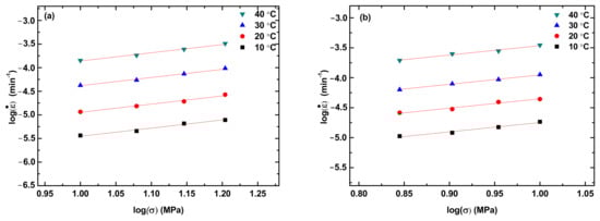 From Figure 3 and Figures S1–S5, we calculate the creep rate at the steady state. Figure 4 shows the variation of the creep rate with the applied stress for the steady state creep of the PLA, PLA/TPU blends, and TPU at different creep temperatures. The creep rate at the steady state increases with the increases in temperature and applied stress, as expected.