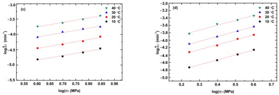 where is the creep rate, A is a pre-exponential constant, σ is the applied stress, and n is the stress exponent. Using Equation (1) to fit the experimental data in Figure 4, we obtain the stress exponent n. For comparison, the fitting curves are included in Figure 4. It is evident that Equation (1) describes well the correlation between the applied stress and the creep rate at the steady-state creep and there is no statistical difference in the stress exponent for the same material. Note that Equation (1) can be used to determine the activation energy for the creep at different temperatures under the same stress/load. For polymer, however, the creep deformation is better described by viscoelasticity as discussed below.