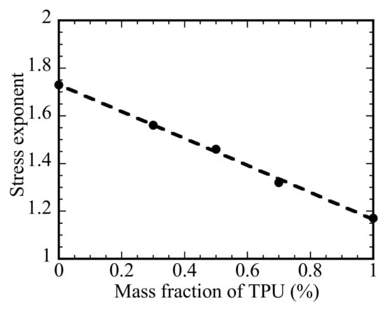 Figure 5 displays the variation of the stress exponent with the mass fraction of TPU. The stress exponent decreases linearly from 1.73 for the PLA to 1.17 for the TPU. Such a trend suggests that increasing the fraction of TPU in the PLA/TPU blend reduces the resistance to the motion of the polymer chains. According to the result in Figure 5, the dependence of the stress exponent on the mass fraction of TPU in the PLA/TPU blend can be expressed as