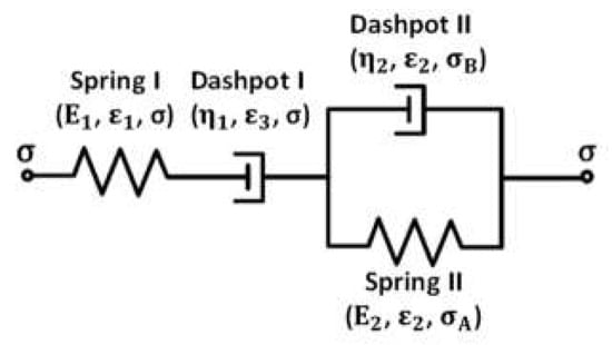Figure 6 shows the schematic of Kelvin representation of the non-linear Burgers model. Here, E1 and E2 are elastic constants of the corresponding spring elements, η1 is the viscosity for nonlinear dashpot I, η2 is the viscosity of the linear dashpot II, σ, σA, and σB are the stresses acting on the corresponding elements, and ε, ε1 and ε2 are the strain of the corresponding elements. The springs I and II and dashpot II are linear elements.