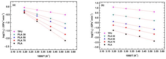 where and are two constants, Qs and Qk are the activation energies of the rate processes for the steady-state creep and transient creep, respectively, R is the gas constant, and T is the absolute temperature. Figure 7 shows the temperature dependence of η1 and η2. It is evident that both the and are exponentially decreasing functions of T−1. Using Equation(5) to fit the data in Figure 7a,b, we obtain the activation energies for the creep deformation of the PLA, TPU, and PLA/TPU blends.