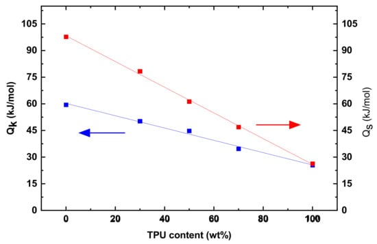 Figure 8 displays variations of Qs and Qk with the mass fraction of TPU. Both the Qs and Qk decrease linearly with the increase of the mass fraction of TPU, suggesting that the activation energies of the PLA/TPU blends can be expressed as