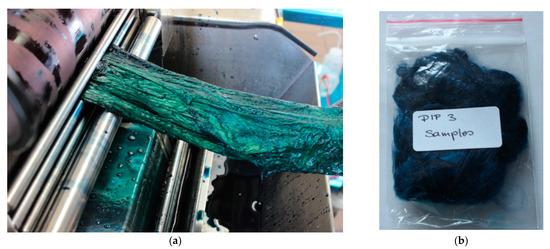 In case of denim recycling the warp of the fabric will contain indigo. Thus CV1 fibres were dyed with indigo according to the rope dyeing procedures used at present [30]. Indigo powder was reduced in a stock vat and a CV1 fibre cable was dyed similar to the technical process by one to three dips. One dip included immersion into the dyebath, squeezing off excess dyebath and air oxidation (greening). A large dyebath volume of 30 L was used to dye the CV1 cable (1 kg) in 1–3 dips (Figure 1). The initial pH in the dyebath was pH 13.07 and a redox potential of −765 mV was measured in the bath, which both dropped during the continuous dyeing to pH 12.08 and −746 mV at the end of the third dip. The redox potential was sufficient negative to maintain the indigo dye in its reduced form, despite the continuous oxidative load brought into the dyebath with the goods.