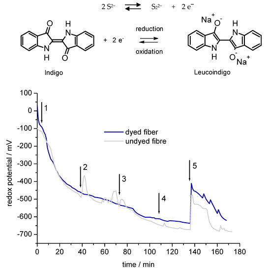 With the addition of CS2 to the alkalicellulose, xanthogenate and sulphidic compounds e.g., sulphide, dithiocarbonate are formed, thus the redox potential decreases (Figure 3) [37]. In Figure 3, the build-up of reducing conditions during the viscose process with undyed cellulose and indigo dyed cellulose (3dip) is shown.