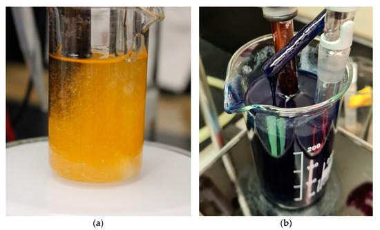 Photographs of cellulose dissolution experiments with measurement of redox potential during the viscose process (a) undyed CV2, (b) indigo dyed CV1.