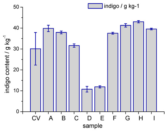 For a technically feasible process concept, the presence of indigo in the cellulose feedstock must not interfere with the dissolution and regeneration process. No significant loss of indigo must occur during the viscose process, e.g., through degradation reactions. Contamination of the regeneration bath through bleeding of dye from the regenerated fibre into the acidic bath must be kept at a minimum. Thus, a series of dissolution–regeneration experiments was performed with dyed CV1 to investigate the compatibility of indigo with the viscose technology (Figures S1–S7 in Supplementary Material). A 3 dips indigo dyed viscose with a dye content of 30.11 ± 7.78 g kg−1 indigo was used as feedstock. After the step of cellulose regeneration, the CIELab coordinates, the K/S value and the indigo content of the regenerates were determined. The results are given in Table 2. The indigo content of the regenerates is presented in Figure 5.