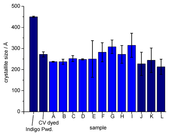 Vat dyes exhibit a characteristic dependency of the colour shade and the intensity on their particle size. Therefore, the direct use of a finely milled vat dye pigment as colorant yields dyeings with comparable low colour yield. By reduction, dissolution of the dye particle is achieved and the molecular disperse dye then forms during reoxidation in the cellulose matrix. This leads to smaller particle size and development of the full colour depth and the typical indigo colour. The determination of the indigo crystallite size was performed to obtain an indication for possible recrystallisation and larger particle formation during xanthogenation and cellulose regeneration. Thus, crystallite sizes of indigo in dyed CV and of solid indigo dye were estimated from the respective X-ray diffractograms (Figure 6) (Figure S12 in Supplementary Material).