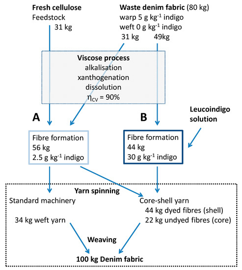 Based on the experimental results presented above, a general scheme for denim recycling and integration of the indigo dyeing technology into the viscose fibre process can be drawn (Figure 9). Representative cases for the indigo concentration in the different streams of material are given.
