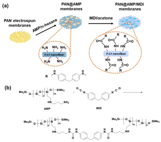 Finally, the PAN@AMP nanofibrous membranes were modified with different concentrations of MDI/acetone solutions through coating treatment, where the solution concentrations were 0.5, 1, 2 and 4 wt%, respectively. Then, the PAN@AMP/MDI nanofibrous membranes were prepared by then being dried in an oven at 100 °C for 30 min for the cross-linking reaction. Relevantly, the PAN@AMP/MDI nanofibrous membranes were defined as PAN@AMP-x/MDI-y, where y is the concentration of MDI/acetone.