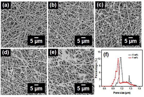 A field emission scanning electron microscope (FE-SEM, Hitachi S-4800, Chiyoda City, Japan) was used to characterize the morphology and structure of the nanofibrous membranes. The pore size and distribution of the nanofibrous membranes were analyzed through the gas permeation pore size analyzer (CFP-1100AX, PMI Inc., Newtown Square, PA, USA). Porosity of the samples was performed using the equation below [25]:
