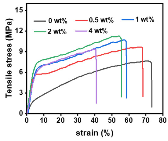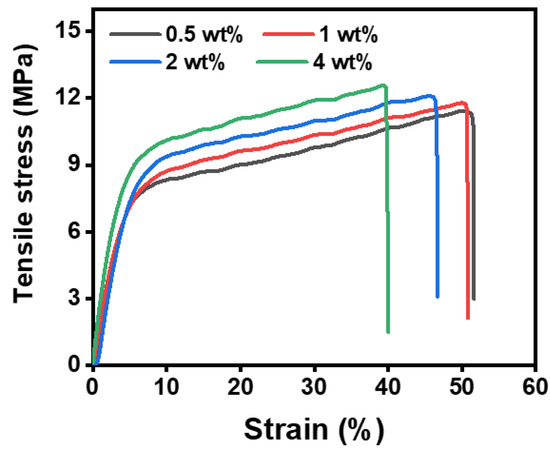 Considering the practical application of the PAN@AMP membranes, the mechanical performance of the modified membranes was measured. From the stress–strain curves in Figure 3, it can be seen that the strength of the untreated nanofibrous membranes were only 7.7 MPa and the strain was 73.4%. The modification of AMP brought about the obvious promotion of the strength of the PAN@AMP membranes. When the concentration of AMP increased from 0.5 to 2 wt%, the strength increased from 9.7 to 11.3 MPa, which increased by 46% compared with the original membranes. The significant promotion was due to the addition of AMP making the nanofibers stick together, endowing the nanofibers with a certain binding force, and increasing the strength of the nanofibrous membranes to a certain extent. However, the AMP concentration was further increased to 4 wt%, the strength of nanofibrous membranes decreased because of the large area film-shaped adhesion structure coving the PAN membranes, and the strength formed by AMP was poor [26]. Different from the law of strength, the strain always showed a decreasing trend from 73.4% to 40.7%, because the increase of the adhesion point made the nanofibers difficult to move and the strain decreased.