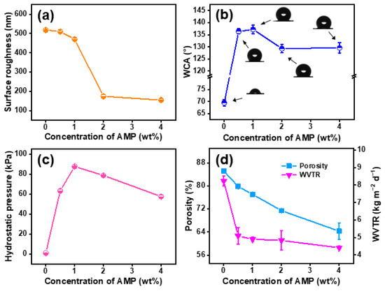 Surface wettability and waterproof breathable permeability of hydrophobically-modified PAN@AMP membranes with different concentrations of AMP: (a) Ra values, (b) contact angle, (c) hydrostatic pressure, (d) porosity and WVTR.