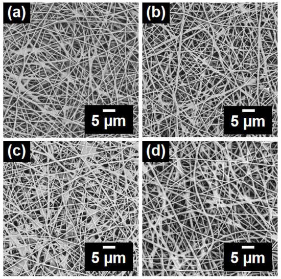 SEM images of PAN@AMP-1/MDI nanofibrous membranes modified by in situ cross-linking of MDI with different concentrations: (a) 0.5, (b) 1, (c) 2 and (d) 4 wt%.