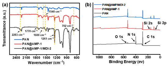 (a) FT-IR spectra and (b) XPS survey spectra of PAN original membranes, PAN@AMP-1 and PAN@AMP-1/MDI-2 nanofibrous membranes.