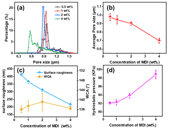 After the apparent morphology of the PAN@AMP/MDI membranes was observed by SEM and their chemical structure was observed by infrared spectra, the microscopic pore structure of nanofibrous membranes was subsequently studied, as shown in Figure 8a and b. In the test of the previous system, it was found that the pore size distribution of PAN@AMP-1 was in the range of 0.81–1.66 μm, with an average pore size of 1.07μm. But after in situ cross-linking with MDI, the pore size of the nanofibrous membranes decreased obviously. Increasing the MDI concentration from 0.5 wt% to 4 wt%, the average pore size decreased from 0.98 μm to 0.70 μm, and the region of concentrated pore size distribution moved towards smaller pore size.