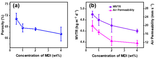 In addition, moisture and air permeability are also the necessary characteristics of outdoor sports clothing. Since the change of porosity can cause the change of the moisture and air permeability of the nanofibrous membranes, it is necessary to test the porosity of the modified membranes, as shown in Figure 9a. With the increase of MDI concentration from 0.5 wt% to 4 wt%, the porosity decreased slightly from 71.1% to 67.1%.