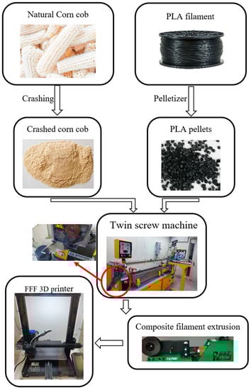 Flowchart of PLA-corn cob composite filament production and the fabrication of test specimens using an FDM 3D printer.