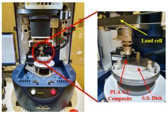 The friction coefficient and specific wear rate for PLA-CC samples were specified using the pin-on-disc test and dry sliding results, according to ASTM G99-95, universal tribometer Mod. UMT-2MT testing block sin T45815 Bruker-Nano Surfaces, as shown in Figure 2. The tribological tests were conducted at a speed of 0.4 m/s, humidity of 60%, and temperature of 26 °C. The PLA-CC composite sample dimensions are 20 mm in length and 8 mm in diameter. The counter face (disc) is stainless steel with a diameter of 8 cm and a surface roughness of 12.5 µm. After each test, the stainless-steel disk was cleaned with acetone and dried using a heat gun to prevent contaminants from other experiments. The tribological results were recorded under loads of 5, 10, 15, and 20 N. In addition, the effect of the sliding time was considered 5, 10, 15, and 20 min. The tribological test was performed six times for each PLA-CC composite sample, and the average coefficient of friction was estimated. The mass of each sample was measured before and after the tribological test, and the specific wear rate was calculated according to Equation (2).