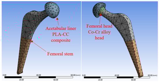 The hip joint was selected as a case study to evaluate the performance of the produced PLA-CC composites on a real biomedical application. In the hip joint, whatever the materials are used in manufacturing, a part called an acetabular liner is made of polymer to prevent direct friction between metallic or ceramic components. The acetabular liner is the part that is usually exposed to different loads due to the motion of the human. Consequently, a finite element model for the hip joint is built using ANSYS, as shown in Figure 3, to investigate the effect of such loads on the performance of the proposed PLA-CC composites. Based on a previous hip joint model that was initiated in JAPAN, the model of the hip joints consists of two main parts [30]. A ball representing the femoral head is usually made of ceramic or Co-Cr alloy; and the acetabular liner is made of polymeric material. The model was meshed automatically by the ANSYS, which meshed the model into hexahedron and tetrahedron elements. After meshing, the model has 2525 nodes and 1247 elements. The boundary conditions were defined according to a previous study where the human load was defined in three directions on the acetabular liner of the hip joint [31]. Based on this study, the forces arising from stumbling for a 100 kg human weight are 1540, 3480, and 70 N in x, y, and z, respectively. Moreover, the ball of the femoral stem is fixed in three directions. To evaluate the performance of the joint in harsh conditions, the contact between the joint parts is defined as bonded. Based on the mechanical properties of the PLA-CC composites, the material of the acetabular liner is defined in the model. After running the model, the maximum shear stress and equivalent stress were recorded.
