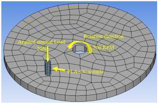 To validate the load-carrying capacity of the PLA-CC composites based on the frictional process, the contact stress during the frictional process should be evaluated. Therefore, an FEA model was built that represents the tribological test using the bin on disk using ANSYS software, as shown in Figure 4.