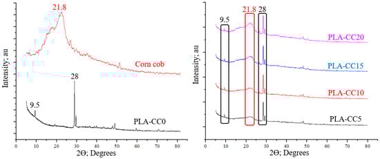 To evaluate the quality of the PLA-CC produced composite. The effect of corn cob insertion on the chemical composition of the PLA, X-ray diffraction (XRD) analysis was performed for PLA, corn cob, and each produced PLA-CC composite, as shown in Figure 6. The XRD showed two main peaks for the pure PLA and one main peak for the corn cob. The high-intensity peak of PLA appears at 2θ of 28.5°; however, the low-intensity one at 2θ of 9.5° which is the same XRD results achieved by Kumar et al. [32]. On the other hand, the main peak of corn cob appeared at 2θ of 21.8°, which is the main peak of alpha-cellulose, as mentioned by Yu et al. [33]. The PLA peak that appeared at 9.5° indicates the addition of cereal starch during the production of the PLA, which in turn raises the PLA biodegradability [30]. In addition, the appearance of the two peaks at 9.5° and 21.8° signifies the extraction of cereal starch from wheat, potato, and tapioca [34]. The pyramid shape of the corn cob XRD pattern indicates the amorphous nature of the corn cob. The XRD pattern of the PLA-CC composites shows a combination between the main peaks of the PLA and the corn cob. However, the intensity of the corn cob peaks varies according to the corn cob weight fraction inside the PLA, which in turn reflects the homogenous distribution of corn cob particles inside the PLA. The absence of new peaks in the XRD pattern of the PLA-CC cob composite represent an indication of the quality of the composite, where no chemical reaction occurred between the PLA and the corn cob [35]. Furthermore, such a composite pattern illustrates that the incorporation of corn cob inside the PLA didn’t affect its original structure.