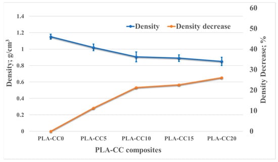 One of the most important parameters representing the composite’s physical properties is density. The density of the composite usually depends on the relative ratio between the matrix and filler. According to Archimedes’ principle [27], the densities of PLA-CC composites were examined experimentally. The PLA-CC composite samples were weighted in air and alcohol. The densities were calculated as shown in Equation (1). Where ρPLA-CC, ρalc, and ρair are the densities [g/cm3] of the PLA-CC composites, alcohol, and air, respectively; mair and malc are the masses of the PLA-CC composites [g] in air and alcohol, respectively. The density for each PLA-CC composite specimen was measured 5 times, and the average was calculated considering the standard errors.