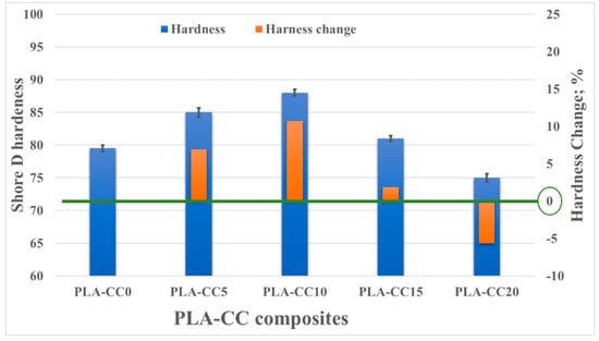 Figure 8 shows the change in the shore D hardness of the PLA-CC composite with the change in corn cob weight fraction. The hardness of the composite increased up to 10%, compared with pure PLA, when the weight fraction of corn cob was 10 wt.%. However, increasing the weight fraction by more than 10% led to a deterioration in the hardness of the composite, which reached −5.6%, compared with pure PLA, for corn cob weight fraction 20 wt.%. The hardness of any composite depends on the intermolecular bonds between the filler, corn cob, and the matrix, PLA. Consequently, the enhancement of hardness of PLA-CC composite with weight fraction 10 wt.% corn cob indicates an enhancement in the bonds between the PLA and corn cob due to the well distribution of corn cob inside the PLA. It was proved that the good filler distribution inside the matrix improves the load transfer between them [36]. On the other hand, increasing corn cob weight fraction up to 15 and 20 wt.% might lead to corn cob filler agglomeration, weakening the intermolecular bonds between the PLA and the corn cob filler.