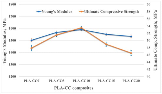 Investigating the load carrying capacity of the PLA-CC composites, a compression test was performed, and the mechanical properties were extracted as shown if Figure 9. Figure 9 illustrates the change in the ultimate compressive strength and Young’s modulus with the change of corn cob weight fraction into the PLA. For both Young’s modulus and ultimate compressive strength, there was an increase in the values due to the addition of corn cob filler up to an optimal value (10 wt.%), beyond which a drop in both of them occurred. The Young’s modulus and ultimate compressive strength of PLA-CC10 were 1590 MPa and 53.5 MPa, respectively, with an enhancement of 6% and 12% with respect to pure PLA. The enhancement in the composite stiffness could interpret as the enhancement in the composite harness [18]. The noticed improvement in the PLA-CC strength may occur because of the uniform distribution of corn cob particles inside the PLA, which facilitates dissipation and absorption of applied compression load. Yang et al. [37] claimed that the existence of filler inside the matrix might stop crack initiation and propagation. However, increasing the corn cob weight fraction to 15 and 20 wt.% decreased the stiffness and strength of the produced PLA-CC composites. The decrease in the mechanical properties for such weight fractions could be attributed to the agglomeration of corn cob filler inside the PLA matrix, weakening the bond between the matrix molecular.