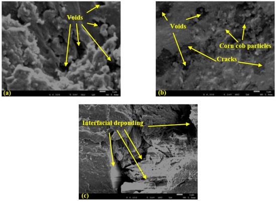 The fractures of the pure PLA, PLA-CC10, and PLA-CC20 were evaluated using a scanning electron microscope, as shown in Figure 10. It is clear that the fractographic features are different in the three cases. The fracture morphology of the pure PLA, Figure 10a, shows many voids, which is in line with the results of Abeykoon et al. [38], who found that even the 3D printing setting is tuned to give 100% density, it doesn’t guarantee the production of samples with no voids. Figure 11 illustrates a microscopic photo for the surface of the produced samples before the compression test. It is obvious the sample surface has many voids. The appeared voids can decrease the mechanical properties of the pure PLA sample. The fractographic features of the PLA-CC10, Figure 10b, illustrates the appearance of void but less than PLA-CC0. That occurred because some of the corn cob filler filled such voids, and some corn cob powder appeared on the fractured surface. Furthermore, there are some cracks that was initiated during the compression test. In the case of PLA-CC20, Figure 10c shows that the agglomeration of corn cob particles facilitates interfacial deponding, resulting in the deterioration of the composite mechanical properties.