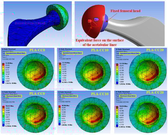 The mechanical evaluation of PLA/corn cob composite shows that incorporating corn cob into PLA can enhance PLA properties. As the developed PLA composite was proposed to be used for artificial implants, a finite element model for a hip joint, as a case study, was built and fed with the extracted PLA-CC properties from the experiments to evaluate the performance of the proposed composite in a real case. Evaluating the generated stresses due to loading can identify the load-carrying capacity of the material. Kuminek et al. [39] claimed that the decrease in the generated contact stresses is evidence of improvement in the load-carrying capacity. Consequently, the stresses generated on the surfaces of the acetabular linear during loading, human weight, were deduced using ANSYS, as shown in Figure 12 and Figure 13. The main boundary conditions that were illustrated in the finite element analysis subsection are illustrated in Figure 11. Furthermore, the stresses generated on the surfaces of the acetabular liner for PLA-CC0, PLA-CC10, and PLA-CC20 are shown in the same figure. The finite element results showed a decrease in the different induced stresses due to adding corn cob filler up to 10 wt.%, as shown in Figure 13. Increasing the corn cob weight fraction above the 10 wt.% increased the induced stresses. The finite element results reflect the change in the mechanical properties that were extracted experimentally. Furthermore, the finite element results prove that 10 wt.% is the optimal weight fraction that can be used with the PLA as it has the best load-carrying capacity. In addition, the maximum generated stress due to loading for 10 wt.% corn cob is 33.11 MPa, less than the ultimate strength of PLA-CC10 by 40%. Such results encourage using the newly developed PLA-CC10 in artificial implants.