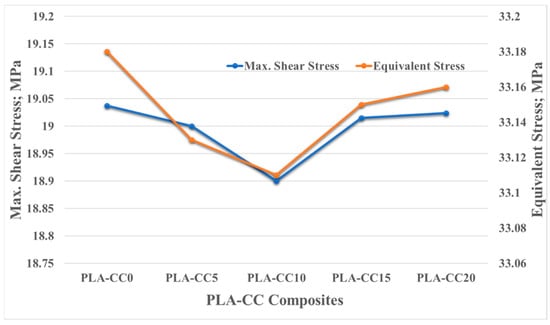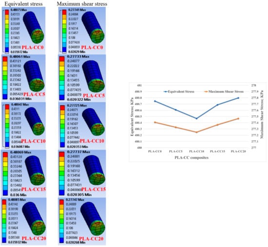 Usually, biomedical implants are designed to work for long periods. Consequently, they should withstand the load if there is a relative motion between the implant components. Therefore, in the current study, the friction coefficient of PLA-CC composite was investigated under 20 N normal load for different sliding times 5 to 20 min that, represents 120 to 480 m, as shown in Figure 15. Increasing sliding distance led to a decrease in the friction coefficient but with the same behavior for the composites where PLA-CC10 recorded the lowest friction coefficient at different sliding distances. The decrease in the friction coefficient could be attributed to the smoothness in the sample surfaces due to the rubbing for a long distance, and the abrasion occurred against the counterpart. Dass et al. [43] claimed that when polymers rubbed for long periods against steel disks, the generated heat could lead to a localized melting for the polymeric samples; in which a thin film from the polymeric material transmits to the steel counterpart working as a third body between the rubbed surfaces causing a decrease in the friction coefficient. Furthermore, the mechanical properties of the PLA-CC showed an enhancement in the load-carrying capacity, and the enhancement of the load-carrying capacity decreases the friction coefficient of the material [41]. To verify the load-carrying capacity based on the frictional process, the stresses generated during the tribological test were recorded using ANSYS software based on the model in Section 2.3.2. Figure 16 shows the equivalent and maximum shear stresses along the PLA-CC composite samples due to the friction under normal load of 20 N. For all composite samples, the maximum equivalent and shear stress appear at the composite edge where the direction of friction could be identified. Figure 16 illustrates that PLA-CC10 has the lowest contact stresses among other composites, indicating that it has the highest load-carrying capacity. This result is in line with the mechanical properties that showed the highest ultimate strength for PLA-CC10 besides the lowest friction coefficient.