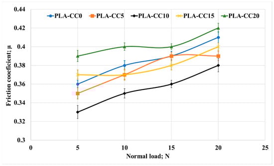 Friction coefficient of PLA-CC composites under different normal loads.