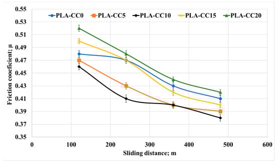 Friction coefficient of PLA-CC composites under different sliding distances.