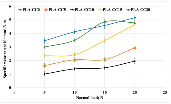 Specific wear rate of PLA-CC composites under different normal loads.