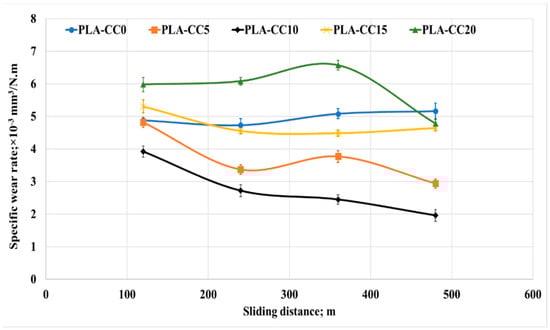 Specific wear rate of PLA-CC composites under different sliding distances.