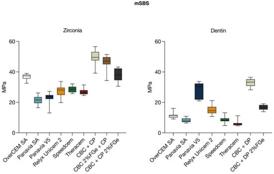 - Adhesion (mSBS) analysis: Due to the non-normal distribution of the data, the comparative analysis among the CBC prototypes and the luting cements was performed using a nonparametric ANOVA (Kruskal–Wallis test) and Dunn’s multiple comparisons test (α = 0.05). The effect of 2 wt.% FG added to DP and CP was analyzed using an unpaired t-test with Welch’s correction;